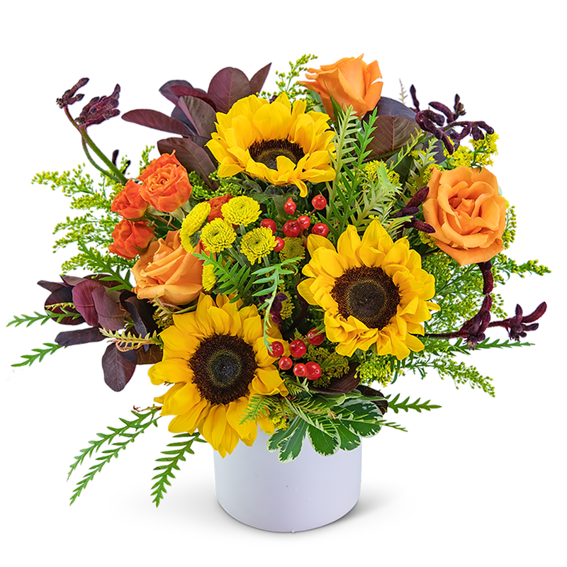 Let someone know they brighten your day! This sunny arrangement features roses, sunflowers, kangaroo paw, hypericum berry, solidago, leucodendron, and grevelia. Whether celebrating a birthday, anniversary, or any special occasion, You Are My Sunshine will add just the right touch of warmth.