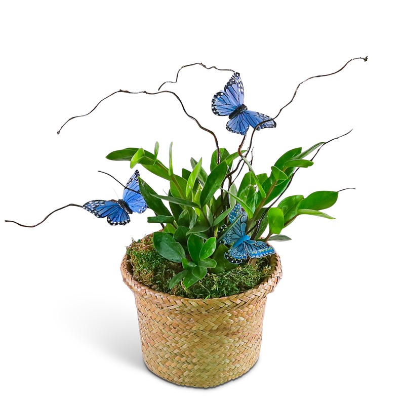 The Zanzibar Gem Plant with Blue Butterflies (also known as the ZZ Plant) is a popular and hardy houseplant thatÕs both attractive and low-maintenance. Known for its air-purifying qualities, it thrives in a variety of light conditions and requires minimal care. We've added a few butterfly and willow accents to bring in a delightful touch of nature, making it an eye-catching addition to any space. As a trusted local florist, we take pride in every order, offering fresh plants delivered directly to the recipient. Our flower shop is committed to providing the highest quality, freshest flowers and plants, and ensuring timely delivery.